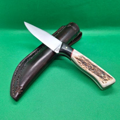 Un beau petit couteau en bois de cerf massif et trapu combiné à une lame large toujours utile.