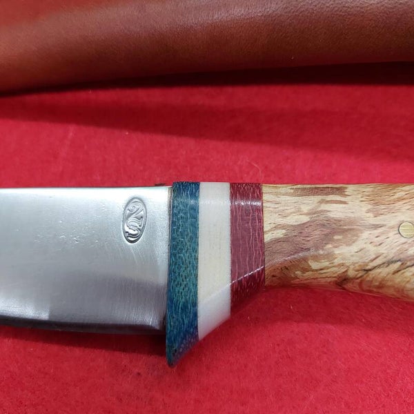 - Manche : bois de hêtre échauffé, garde intercalaires micarta bleu, blanc, rouge