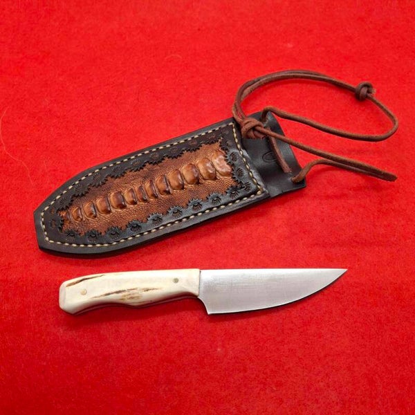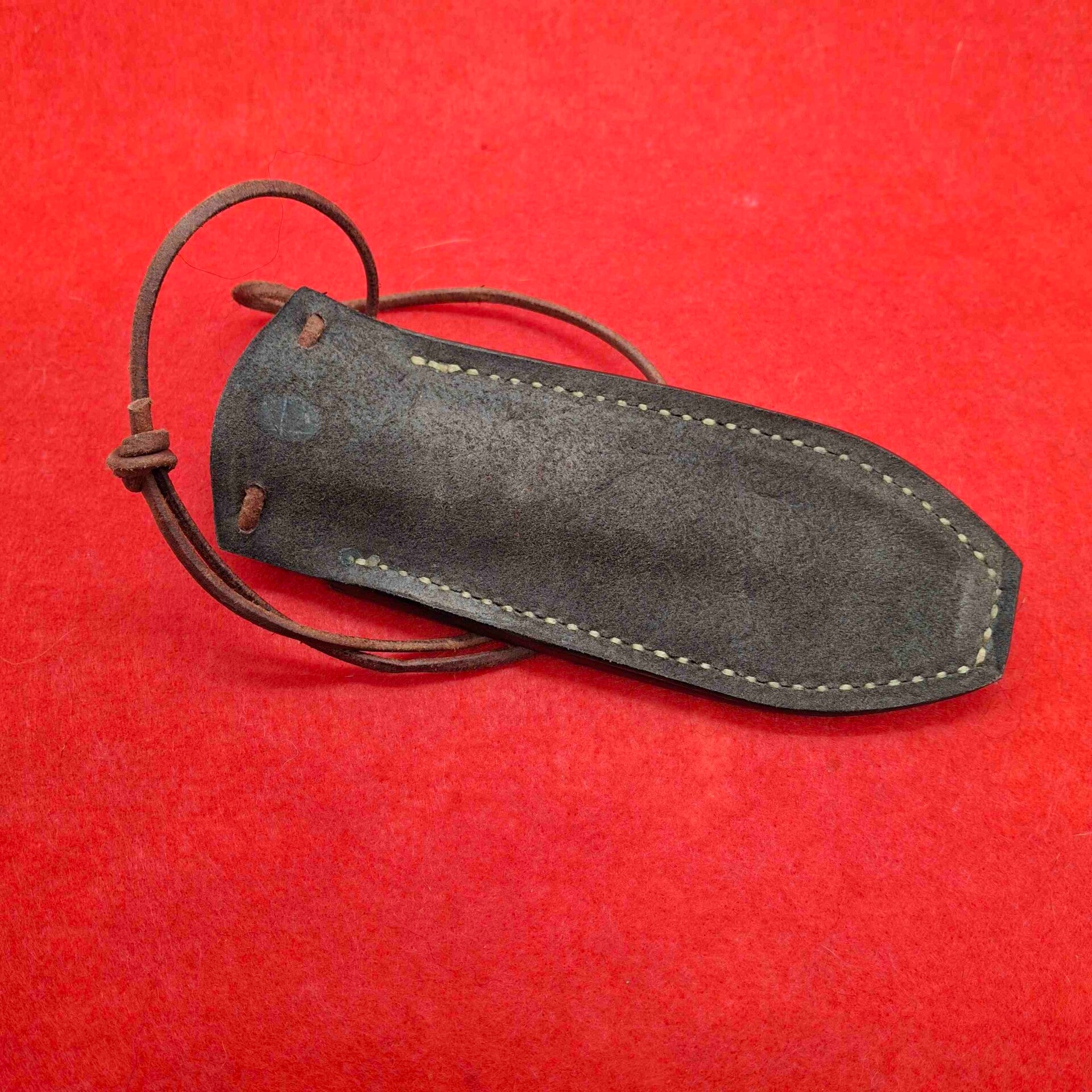 Etui : modèle PLAT AMBIDEXTRE très fonctionnel, sert pour droitier ou gaucher ; il suffit de tourner le couteau grâce au martyr qui fait le tour de l’étui. Cuir végétal Hermann Oak (USA) 1er choix, couleur marron foncé, incrustation patte d’autruche, avec liseré repoussé, couture sellier à la main, lacet tour de cou cuir coulissant.