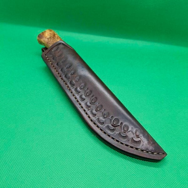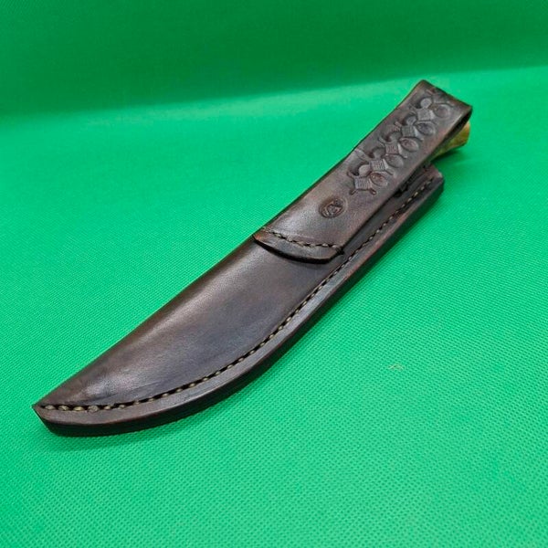 Etui : Cuir végétal Hermann Oak (USA) 1er choix, teinté marron foncé, repoussage géométrique, couture sellier à la main, passant repoussé.