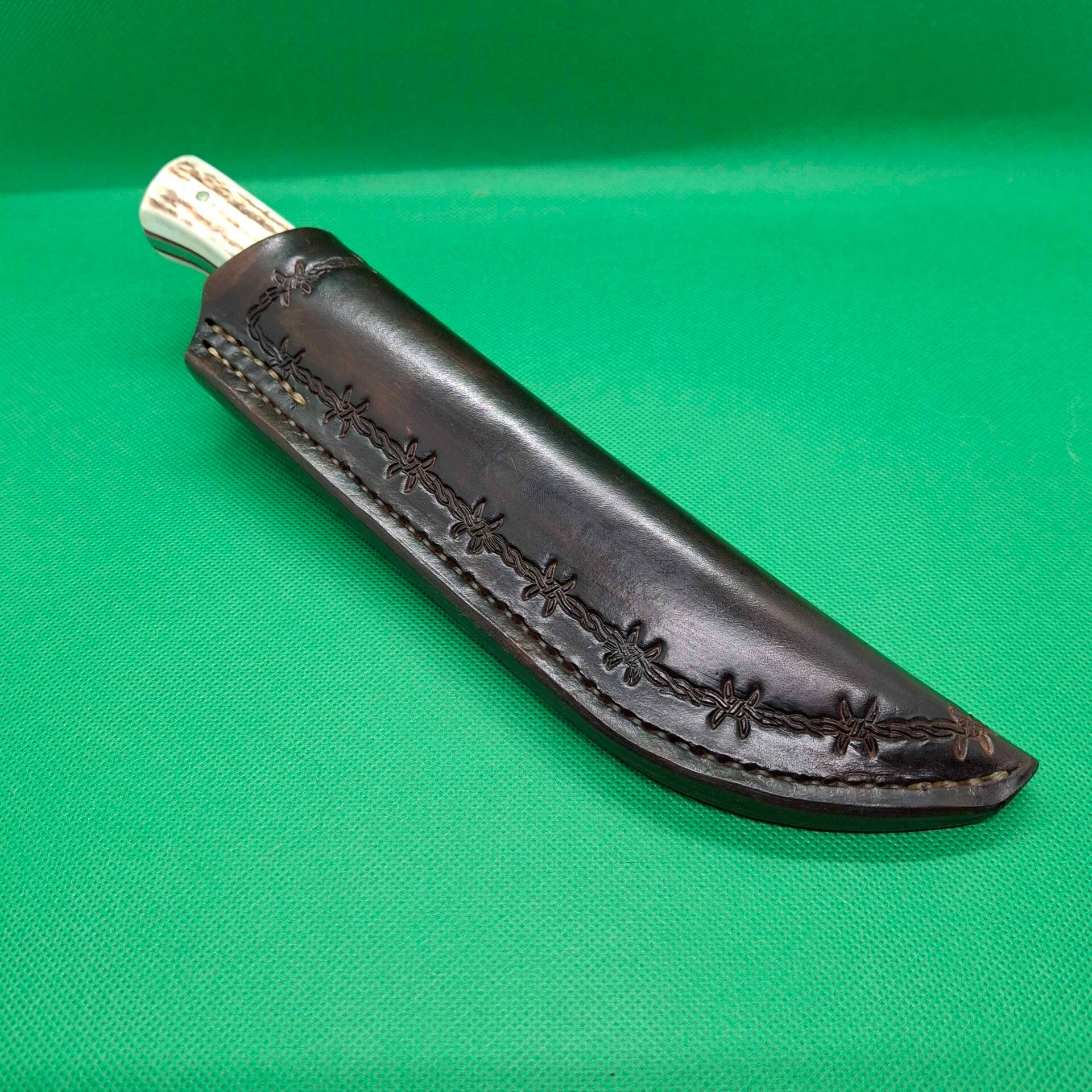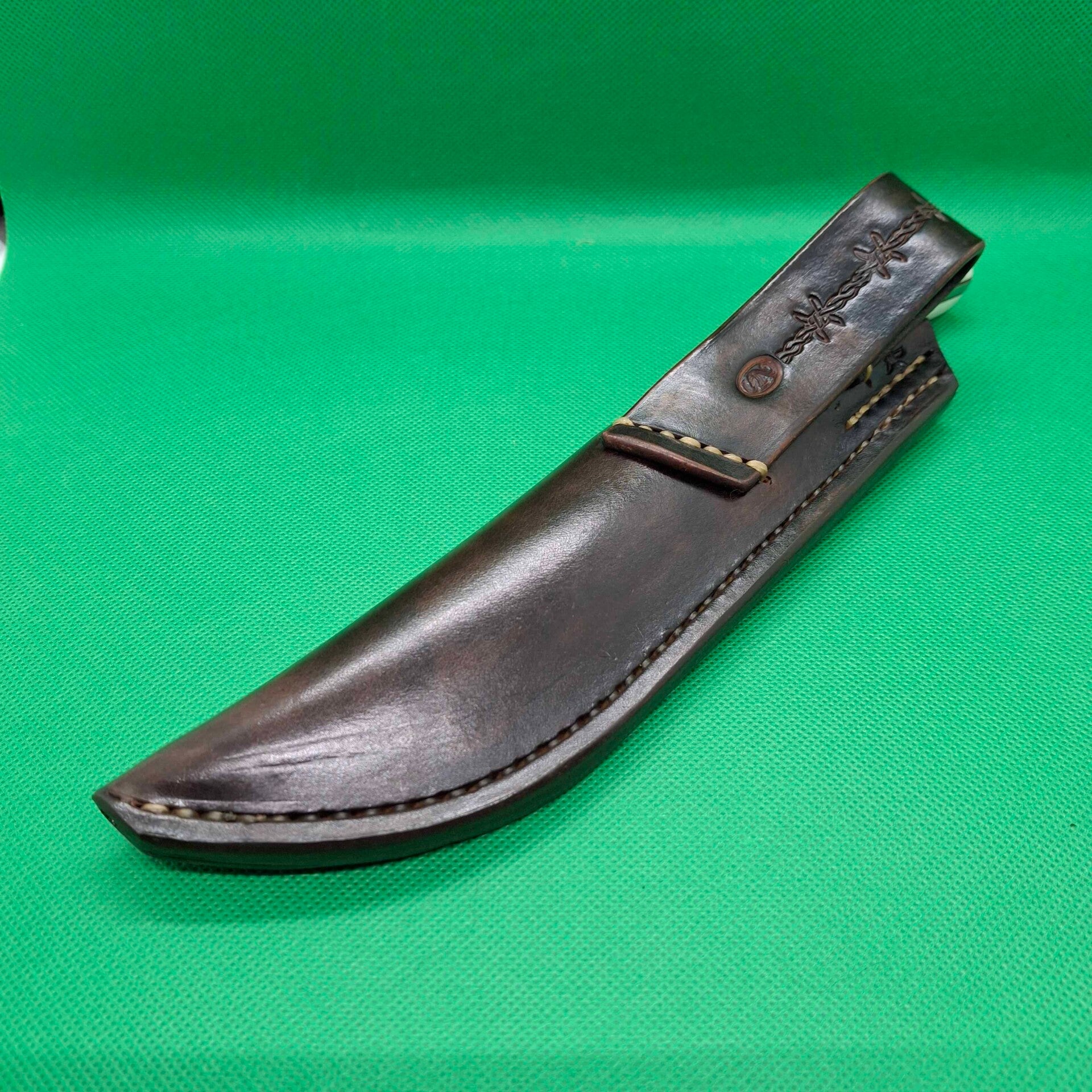 Etui : Cuir végétal Hermann Oak (USA) 1er choix, teinté marron foncé, repoussage fil de fer, couture sellier à la main, passant repoussé