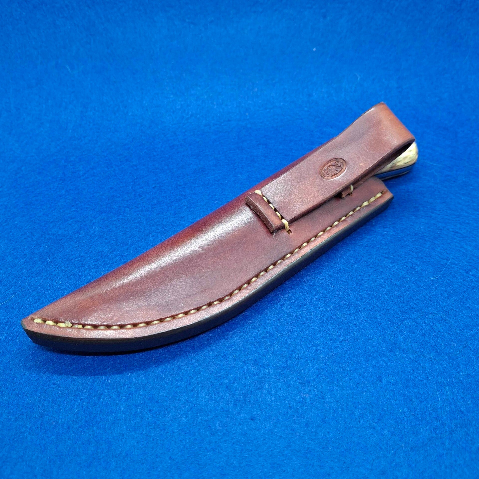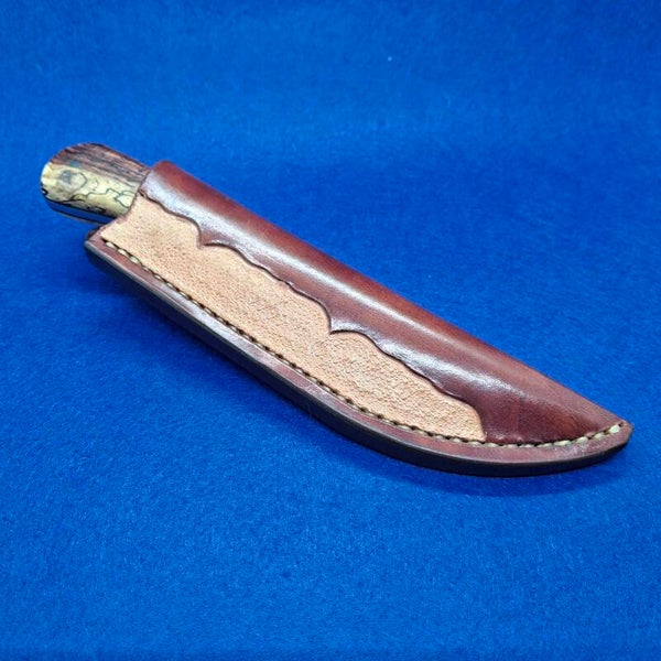 Etui : Cuir végétal Hermann Oak (USA) 1er choix, teinté marron clair et naturel, repoussage peau de crapaud sur la partie naturel, couture sellier à la main, passant simple