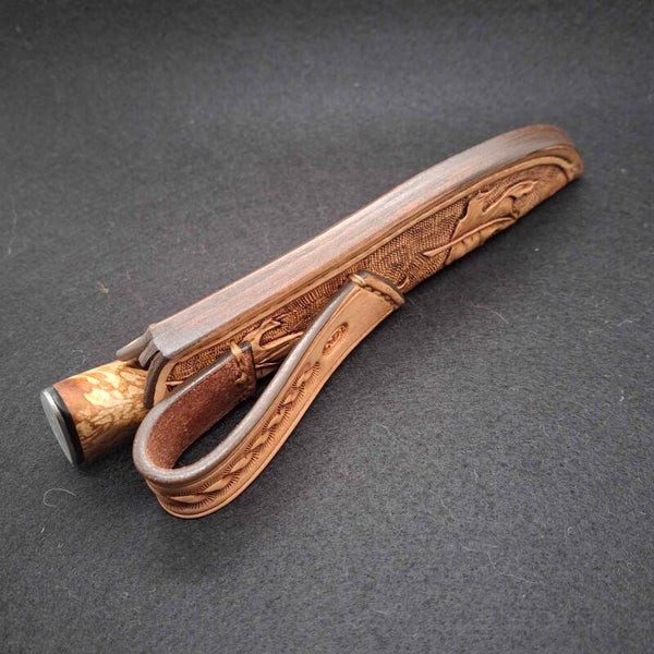 Etui : Cuir végétal Hermann Oak (USA) 1er choix, repoussage feuilles d’érable, teinté avec teinture antique sheridan, couture sellier à la main, passant repoussé