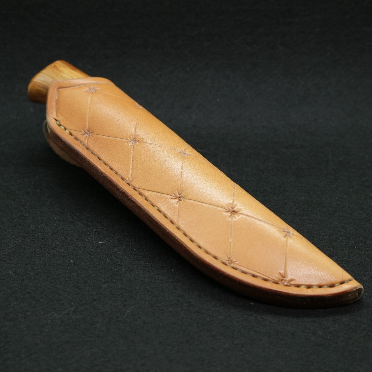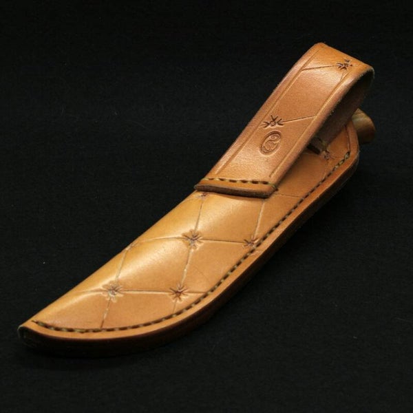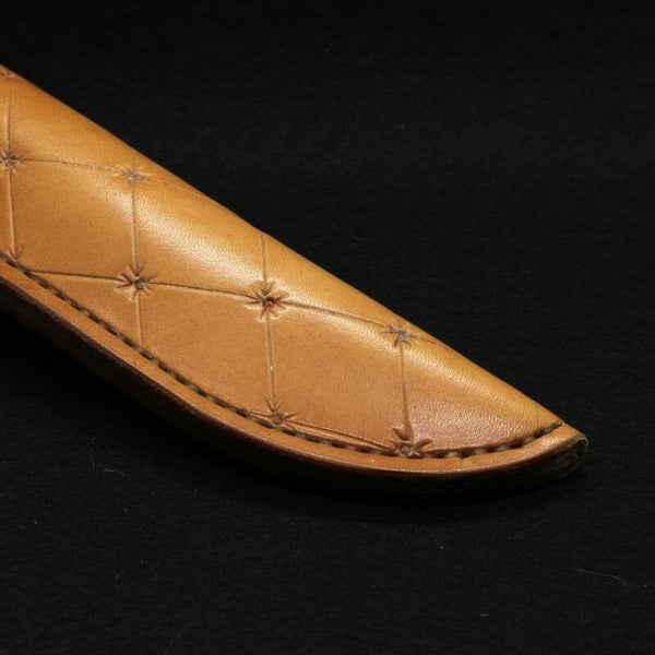 Etui : Cuir végétal Hermann Oak (USA) 1er choix 3.5 mm, naturel, repoussage motifs style capitonnage Chesterfield, couture sellier à la main, passant fantaisie