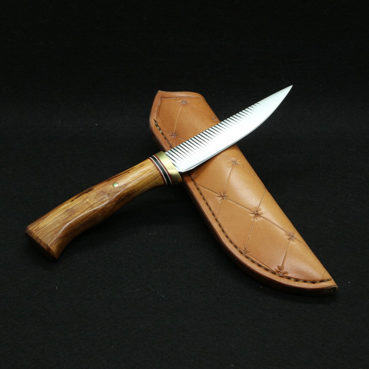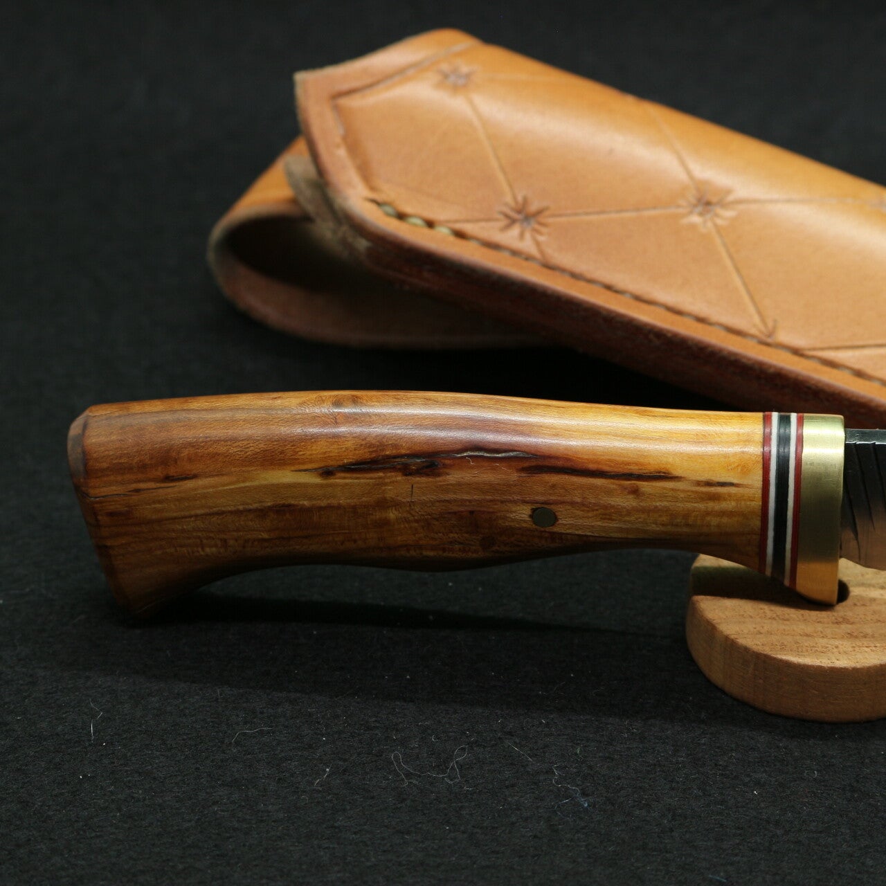 - Manche : garde laiton, intercalaire vulcanisé rouge/blanc/noir, manche en bois de fourche d’amandier de Provence