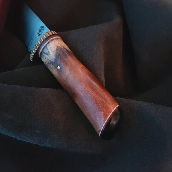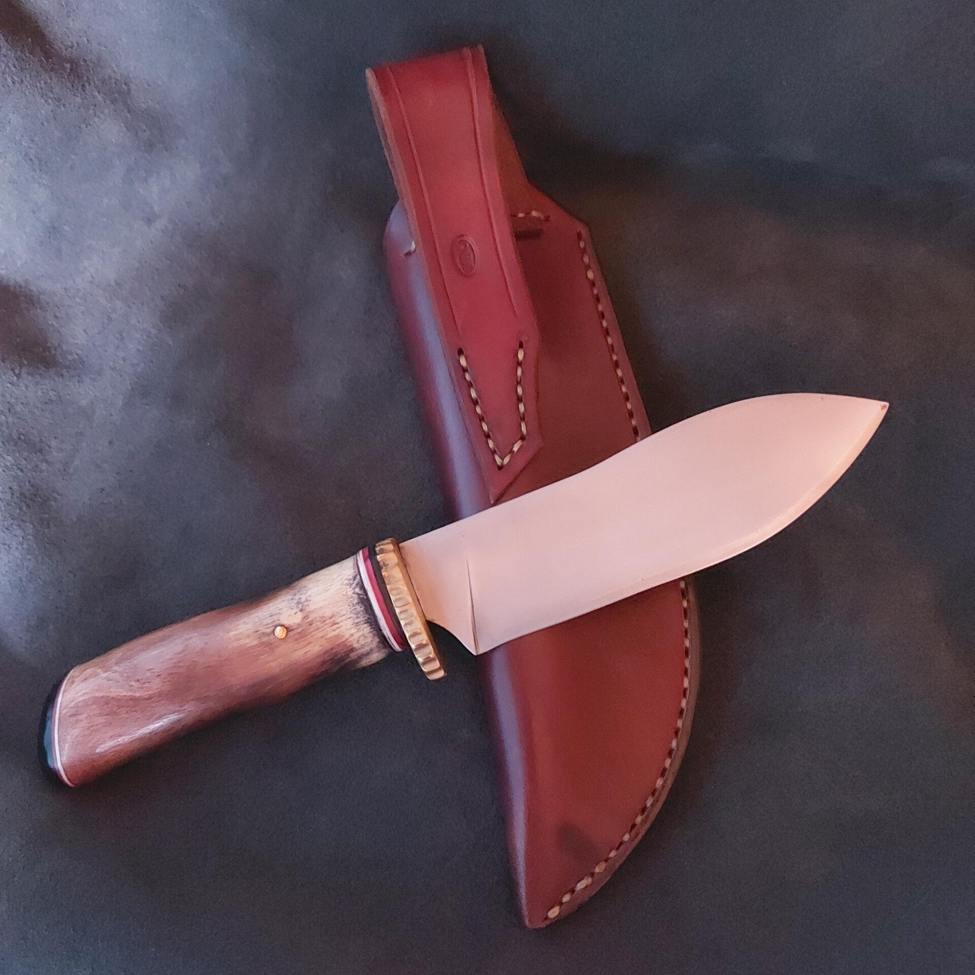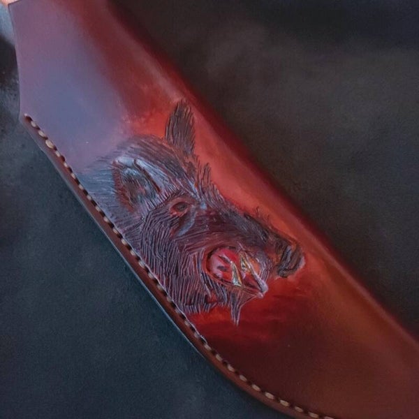 Etui : cuir végétal Hermann Oak, couleur marron acajou, repoussé tête de sanglier, couture sellier à la main, passant simple