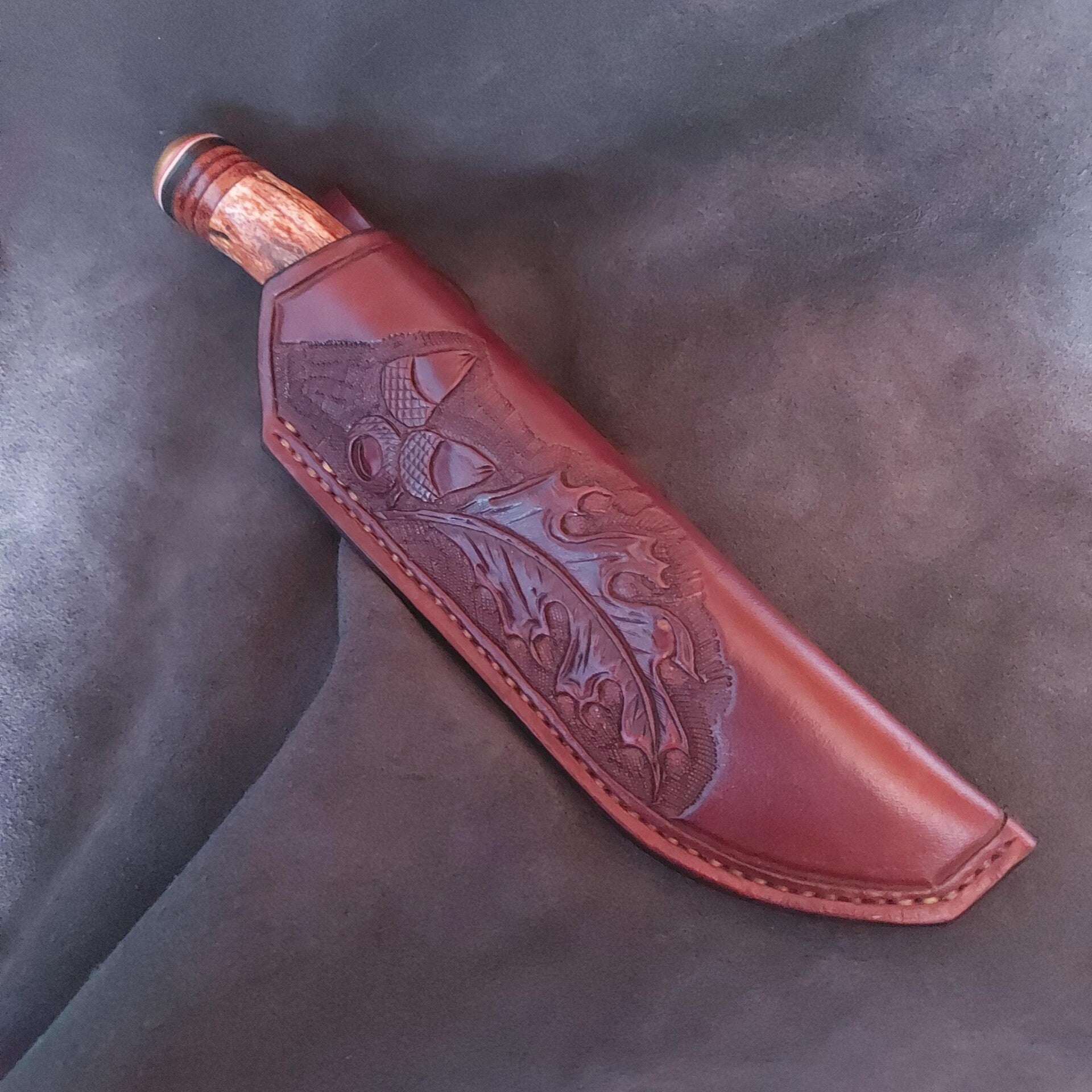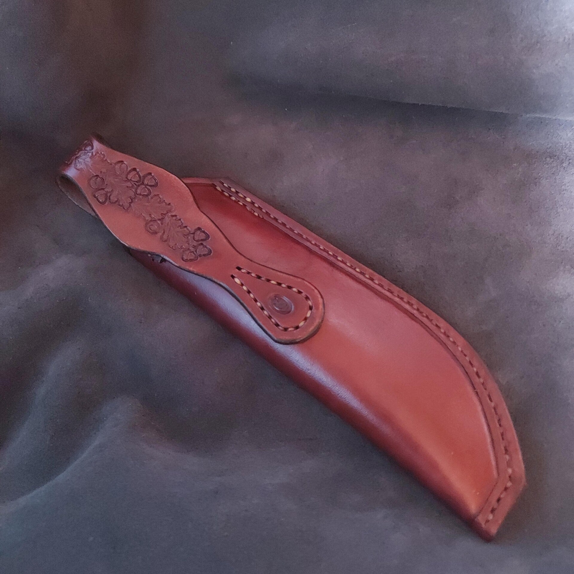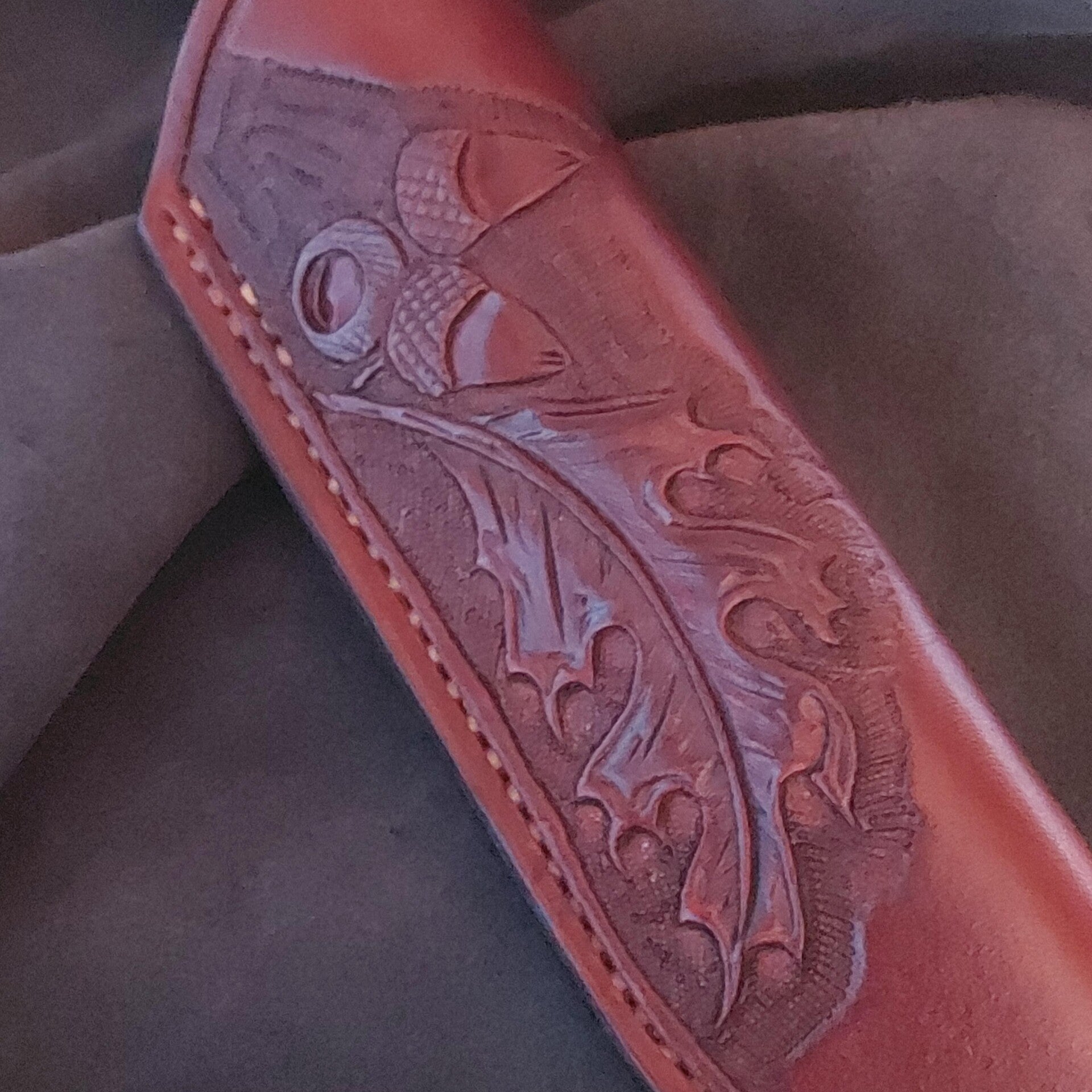 Etui : cuir végétal Hermann Oak, couleur marron foncé repoussé feuille de chêne et glands, couture sellier à la main, passant repoussé feuilles de chênes et glands